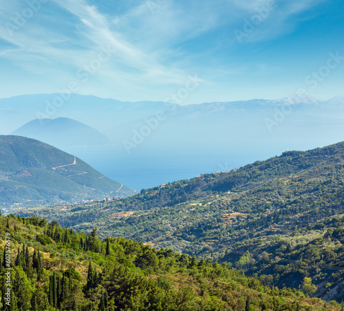 Obraz premium Misty summer hilly coast panorama (Greece, Lefkada). View from up.
