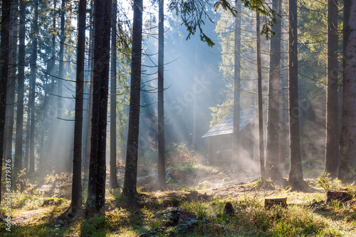 © anatoliil, Fototapeta premium Misty sunny morning in forest.