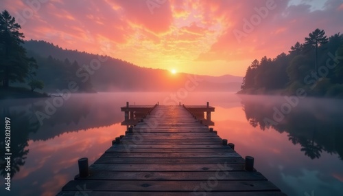 © ทุติยาภรณ์ หงษา, Naklejka premium Misty sunrise, ancient wooden jetty on still lake, jetty, mystical