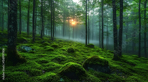 © pete99, Obraz premium Misty sunrise in a lush green forest with moss-covered rocks.