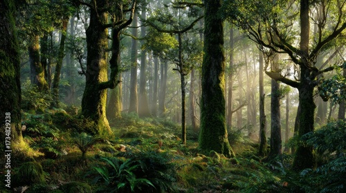 Fototapeta premium Misty Sunrise in Ancient Forest