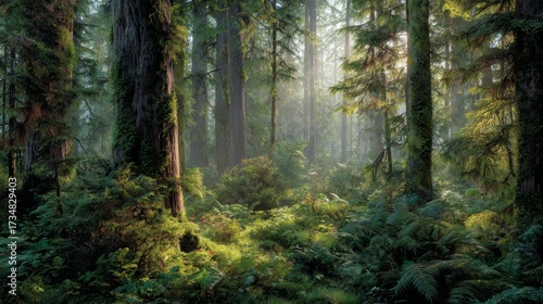 Fototapeta premium Misty Sunrise in Ancient Forest