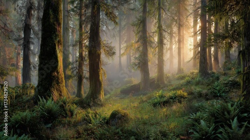 Obraz premium Misty Sunrise in Ancient Forest
