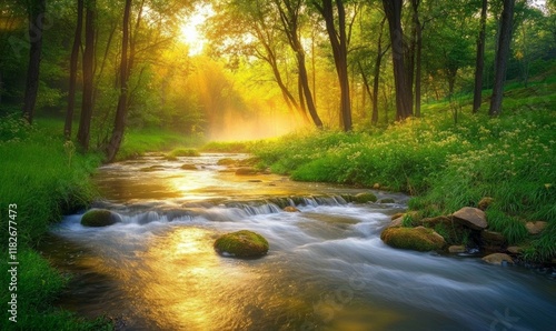 © Valentyna, Obraz premium Misty sunrise in the woods with a calm river flowing through. Perfect for relaxation and rejuvenation.