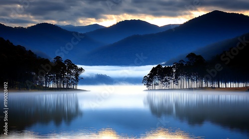 Fototapeta premium Misty sunrise lake, mountain reflection, calm waters, travel poster.