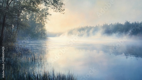 Fototapeta premium Misty sunrise lake, tranquil forest, calm water, nature scene, peaceful...