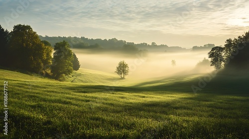 © atar, Obraz premium Misty Sunrise Meadow Landscape