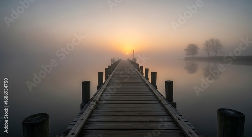 Fototapeta premium Misty Sunrise on a Wooden Pier Extending into a Calm Lake