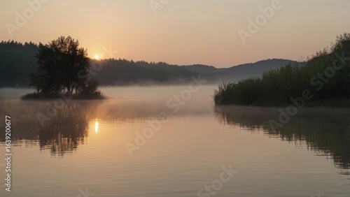Fototapeta premium Misty Sunrise Over a Serene Lake with Silhouetted Trees