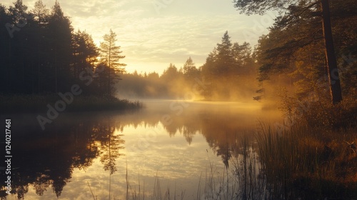 © Vdo, Obraz premium Misty Sunrise Over a Tranquil Forest Lake