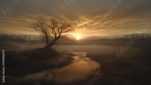 Fototapeta premium Misty sunrise over a tranquil stream, with a lone tree silhouetted against...