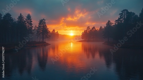 Obraz premium Misty sunrise over boreal lake, reflecting fiery sky