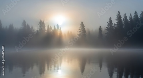Fototapeta premium Misty Sunrise Over Calm Lake and Forest.