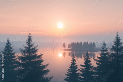 © Demok, Fototapeta premium Misty sunrise over calm lake, silhouetted pine trees reflecting in water.