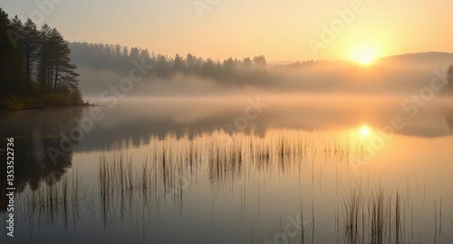 © Didarul, Obraz premium Misty sunrise over calm lake with tree reflections and golden sky.