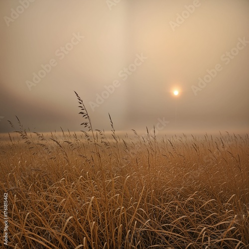 Obraz premium Misty Sunrise Over Golden Grass in Serene Landscape Atmosphere