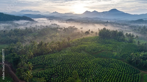Fototapeta premium Misty Sunrise Over Lush Green Plantation and Mountains
