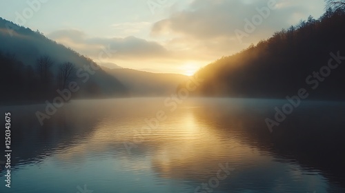 © yesdfg, Fototapeta premium Misty Sunrise over Mountain Lake