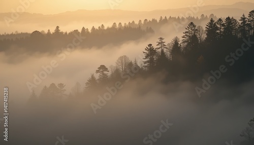 © MDzAi, Fototapeta premium Misty sunrise over pine forest nature photography scenic landscape tranquil environment aerial view serene atmosphere for nature lovers