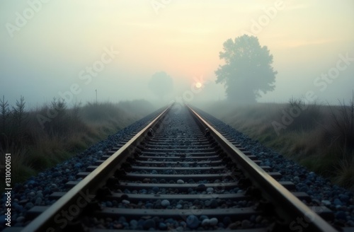 © Sergey, Obraz premium Misty sunrise over railway tracks in tranquil countryside landscape