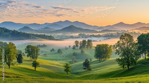 Obraz premium Misty sunrise over rolling green hills and mountains.