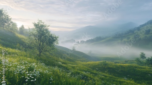 Fototapeta premium Misty sunrise over rolling green hills and wildflowers.