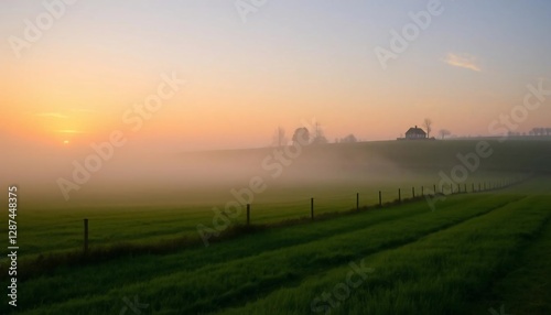 Fototapeta premium Misty Sunrise over Serene Farmland