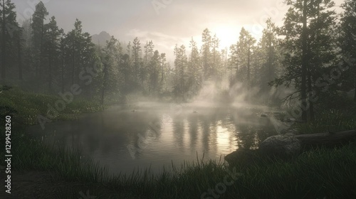 © harryaishi, Fototapeta premium Misty sunrise over serene forest lake.