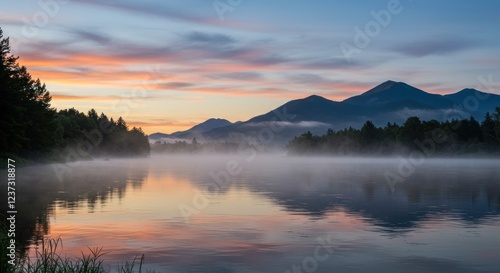 Fototapeta premium Misty Sunrise Over Serene Mountain Lake