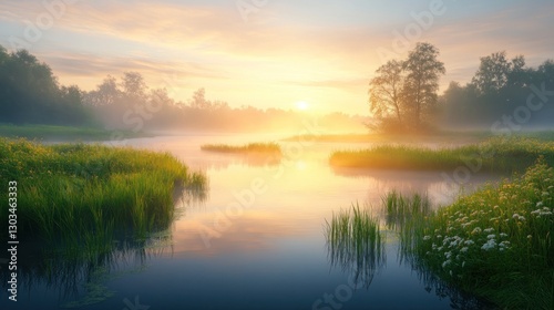 © AR99, Fototapeta premium Misty Sunrise Over Serene River Landscape