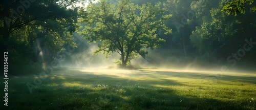 Fototapeta premium Misty Sunrise Over Serene Summer Meadow. Concept Nature Photography,...