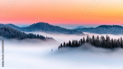 © Praphan, Fototapeta premium Misty Sunrise Over Snow Covered Hills