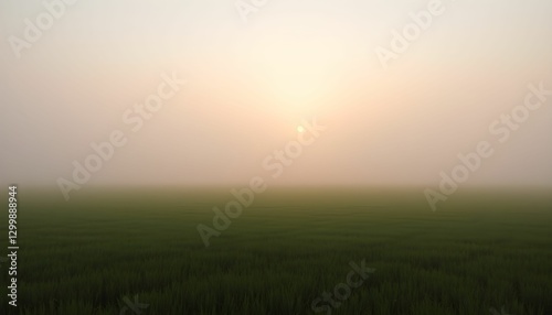 © Andini, Obraz premium Misty Sunrise Over the Paddy Field: Serene Rural Landscape