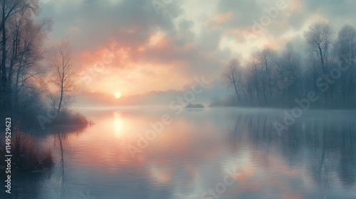 © Ali, Fototapeta premium Misty sunrise over tranquil river, bare trees.
