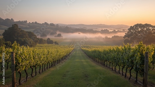 © wahyu, Naklejka premium Misty sunrise over vineyard rows.