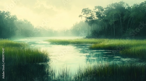 Obraz premium Misty sunrise river, swamp, forest, tranquil, nature, calm, serene, peaceful,...