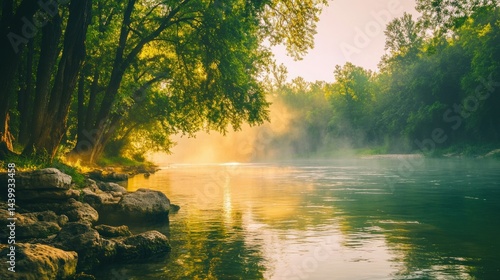 © Mursid, Fototapeta premium Misty Sunrise Riverbank Forest