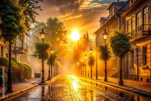 © Arnada, Obraz premium Misty Sunrise Street Scene: Golden Hour Urban Photography