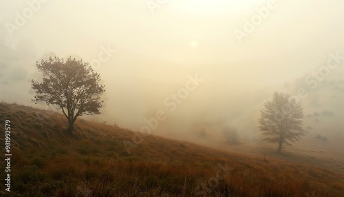 © Mityarko, Obraz premium Misty Sunset Landscape with Leafless Trees