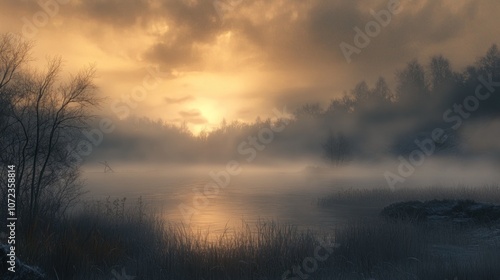 Fototapeta premium Misty Sunset Over a Tranquil Lake