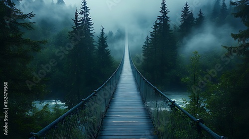 © Purnomo adi, Obraz premium Misty suspension bridge over river in dark forest.