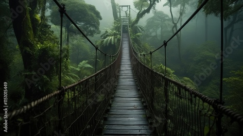 Obraz premium Misty Suspension Bridge Surrounded by Lush Green Forest in a Tranquil Rainy...