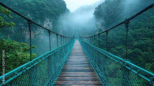 Obraz premium Misty suspension bridge surrounded by lush green mountains, creating a serene...