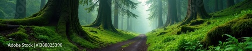 © Jiampoj, Obraz premium Misty trail, ancient trees draped in moss, Pacific Northwest, outdoor, pacific northwest
