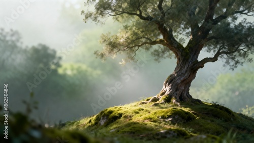 Obraz premium Misty tree on mossy hill