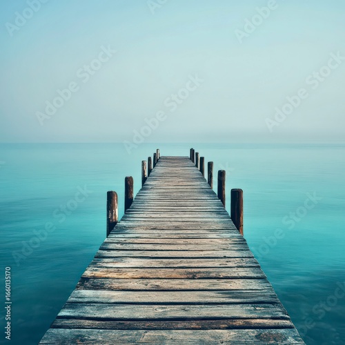 © gen_pick, Naklejka premium Misty turquoise lake with pier, ideal for travel visuals, lifestyle blogs, wellness inspiration
