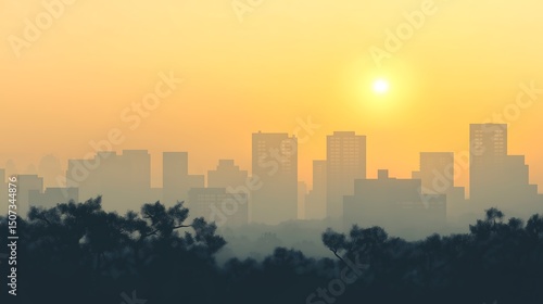 © Ihsanfir, Fototapeta premium Misty Urban Skyline at Sunrise – Atmospheric Cityscape with Skyscrapers and Fog