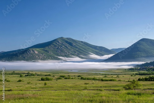 © ammar, Fototapeta premium Misty valley nestled between rolling hills under a clear sky