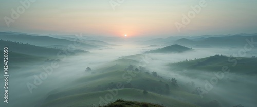 © DEER FLUFFY, Naklejka premium Misty valley sunrise view from high hill.