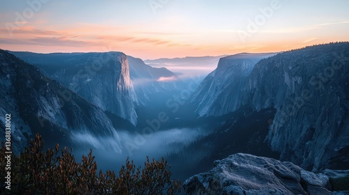 Obraz premium Misty valley sunrise with towering cliffs and vibrant sky - serene landscape